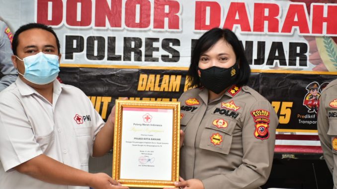 Dalam kegiatan ini Kapolres menerima penghargaan sebagai penyelenggara kegiatan donor darah sukarela dalam rangka HUT Bhayangkara Ke-75 dari Ketua PMI Kota Banjar Supratman. (YR)