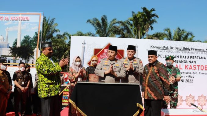 Pekanbaru, mediaotonomiindonesia.com – Wakapolri Komjen Gatot Eddy Pramono melakukan peletakan batu pertama pembangunan Masjid Al Kastoeri, Jalan Sri Sejahtera Kelurahan Agrowisata Kecamatan Rumbai Barat, Kota Pekanbaru, Riau, Selasa (28/6/2022).