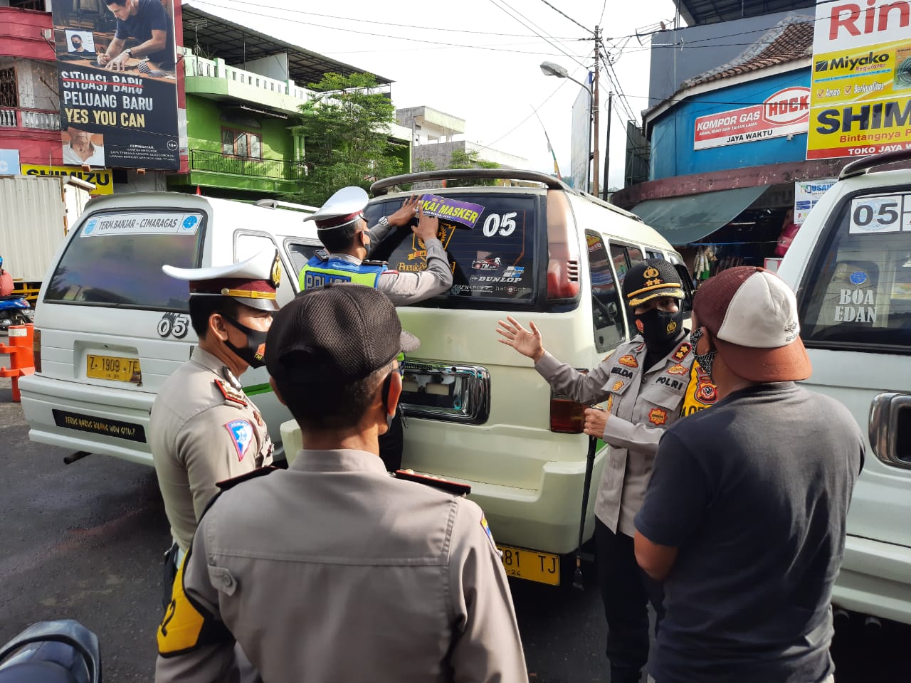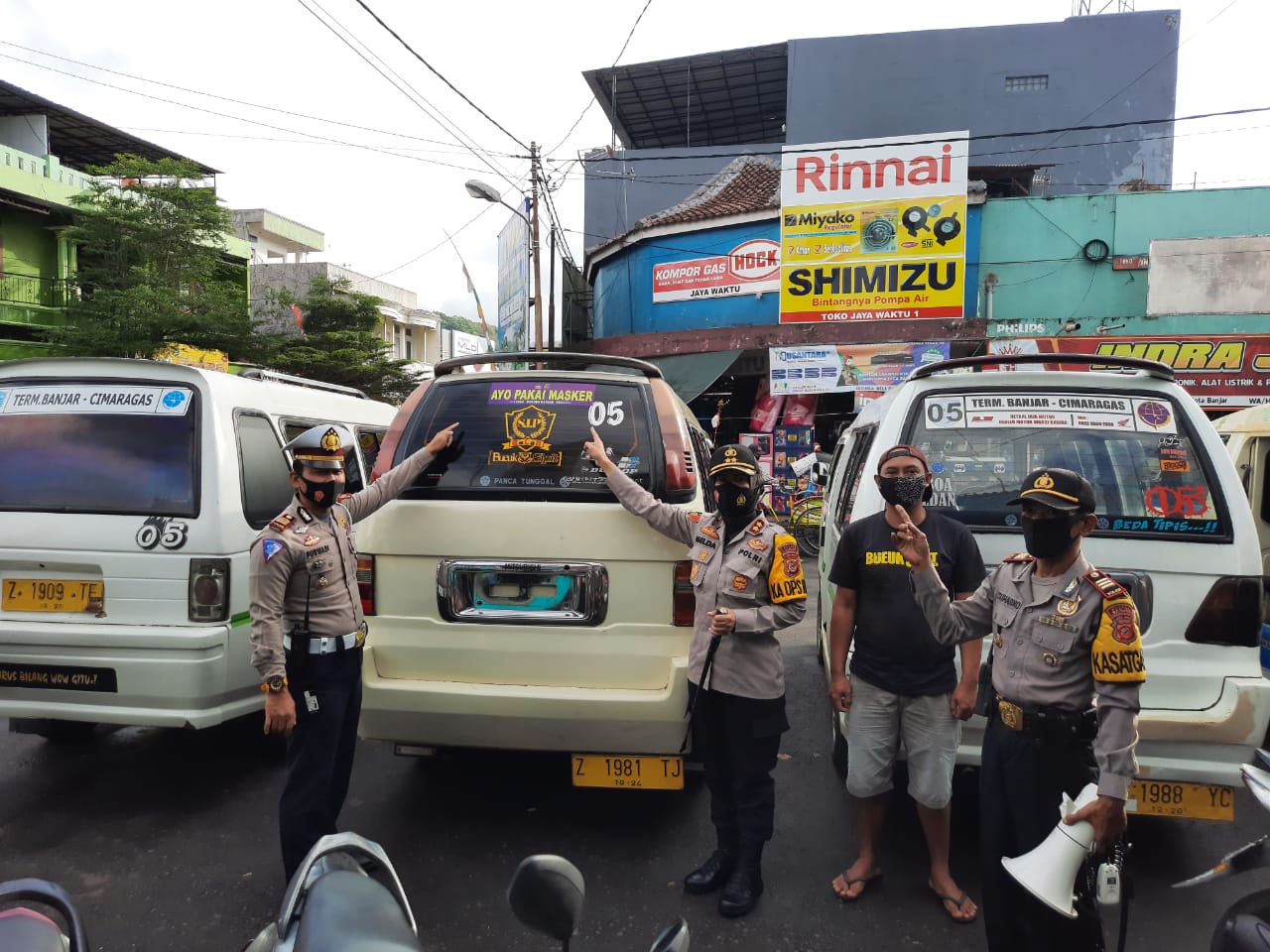 BANJAR, MEDIA OTONOMI INDONESIA – Berloaksi di Pasar Kota Banjar Kapolres Banjar AKBP Melda Yanny, bersama Kasat Binmas dan Kasat Lantas beserta Personil Sat Lantas Polres Banjar memasangkan stiker ajakan menggunakan masker, Senin (28/9/2020).