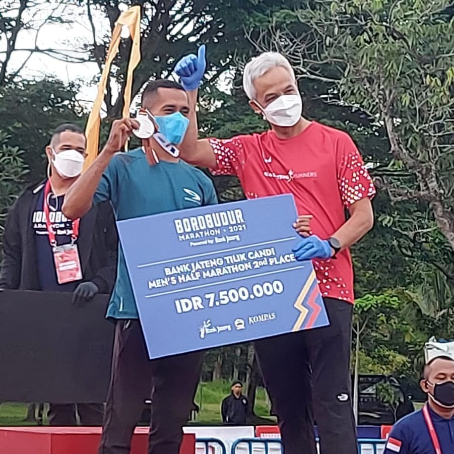 Hadiah para juara lomba Marathon Borobudur Bank Jateng tilik Candi di berikan langsung oleh Gubernur Jawa Tengah Ganjar Pranowo. (Yudhi’s-Pen 323/BP Kostrad)