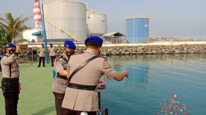 MERAK_BANTEN, MEDIA OTONOMI INDONESIA – Untuk mengenang jasa para pahlawan, jajaran Kepolisian Daerah (Polda) Banten melakukan tabur bunga di perairan sekitar Dermaga Sultan Ageng Tirtayasa Ditpolairud Polda Banten di Merak Kota Cilegon. Selasa, (29/06/2021).