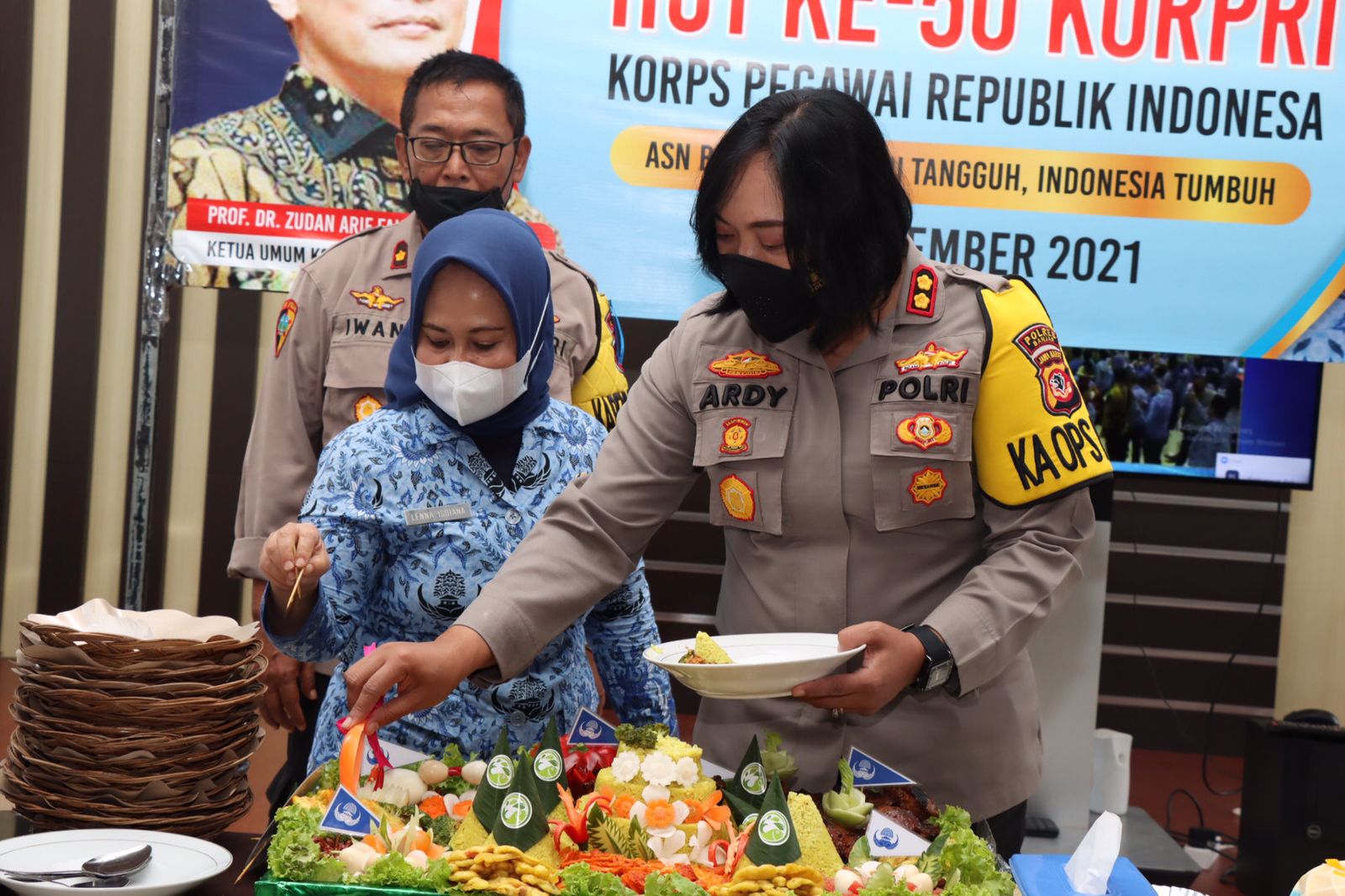 Setelah melaksanakan upacara tersebut dengan dipimpin oleh Kapolres, dan diikuti oleh Wakapolres Banjar serta Pejabat Utama dan ASN Polres Banjar menggelar syukuran secara sederhana dengan memotong tumpeng dan kue ulang tahun bertuliskan Selamat Ulang Tahun Korpri ke-50.