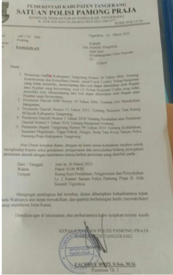 TANGERANG, MEDIA OTONOMI INDONESIA – Pengelola Indo Jaya atau pemilik bangunan toko sepeda di Kecamatan Cisoka diduga mangkir dari panggilan Satuan Polisi Pamong Praja (Satpol PP) Kabupaten Tangerang, setelah sebelumnya Satpol PP melayangkan surat panggilan terhadap pemilik bangunan tersebut, Kamis (25/3/2021) kemarin.