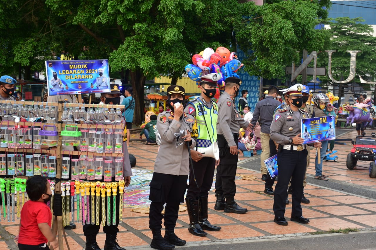 BANJAR, MEDIA OTONOMI INDONESIA – Kepala Kepolisian Resor Banjar AKBP Melda Yanny beserta Wakapolres, Para Kasat, dan Personel serta Sat Pol PP mendatangi Alun-alun Kota Banjar, mengedukasi serta sosialisasikan protokol kesehatan dan kebijakan pemerintah terkait larangan mudik, Jum’at (30/4/2021).