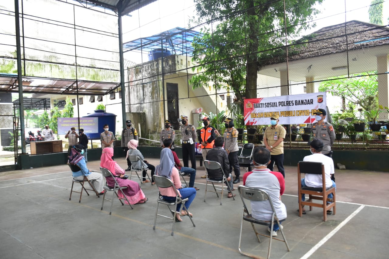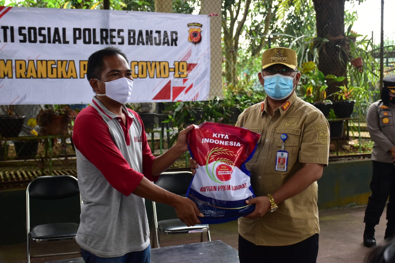 Kegiatan tersebut dilaksanakan di Lapang Tenis Pendopo Banjar, bantuan tersebut merupakan salah satu kegiatan dari bhakti sosial yang dilakukan Polres Banjar kepada masyarakat yang terdampak selama PPKM Level 4, Jum’at (30/7/2021).