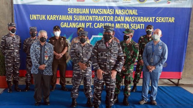 mediaotonomiindonesia.com, Banten –Gubernur Banten Wahidin Halim (WH) yang diwakili oleh Asisten Administrasi Umum Setda Provinsi Banten Samsir, meninjau vaksinasi bagi karyawan dan sub kontraktor PT CMS serta masyarakat yang diadakan oleh Komandan Pangkalan TNI Angkatan Laut Banten di Galangan Kapal PT Caputra Mitra Sejati (CMS), Kamis (29/7/2021).