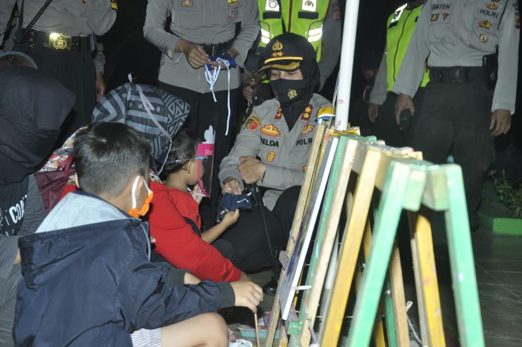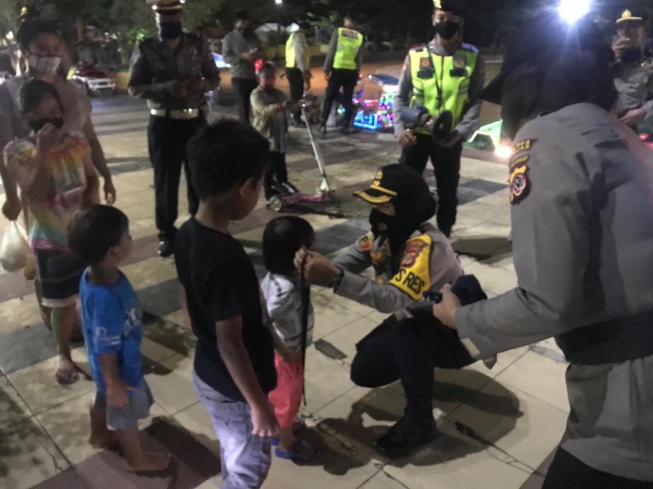 Di Taman Kota Banjar, Kapolres Banjar menghampiri beberapa balita yang sedang bermain bersama orang tuanya, dan sempat berinteraksi dan memberikan serta memakaikan masker kepada anak-anak tersebut.
