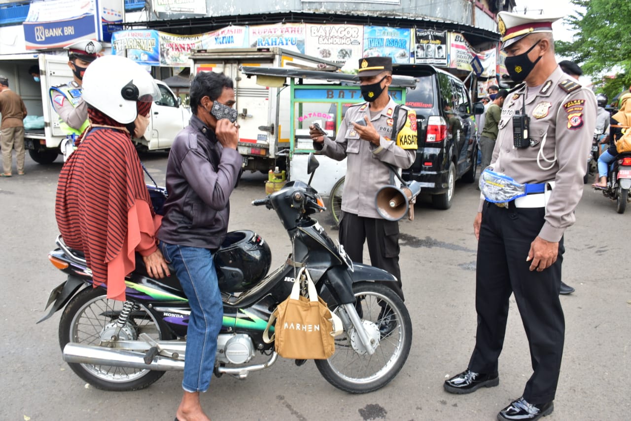 Tidak hanya menyampaikan himbauan prokes, Kapolres juga menegur pelanggar prokes yang tidak menggunakan masker.