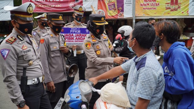 BANJAR, MEDIA OTONOMI INDONESIA – Berlokasi di sekitaran simpang 4 Majelis Konghucu Indonesia dan Pasar Kota Banjar, Kapolres Banjar AKBP Melda Yanny bersama Para Perwira dan Personel Polres Banjar kembali menyampaikan himbauan protokol kesehatan kepada warga masyarakat yang sedang beraktifitas, Rabu (31/3/2021).
