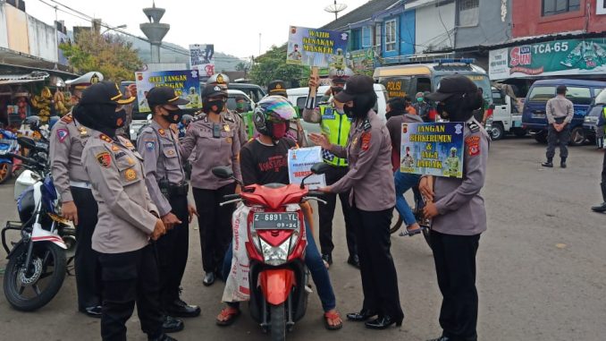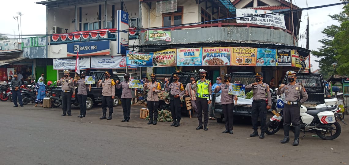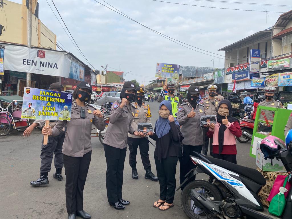 BANJAR, MEDIA OTONOMI INDONESIA – Kepala Kepolisian Resor Banjar Polda Jabar AKBP Melda Yanny, didampingi Wakapolres Banjar, Kasat Lantas Polres Banjar bersama personil Polwan Polres Banjar Polda Jabar menyampaikan himbauan 3M Protokol Kesehatan, yakni Memakai Masker, Mencuci Tangan, dan Menjaga Jarak, di pasar Kota Banjar, Senin (31/8/2020).